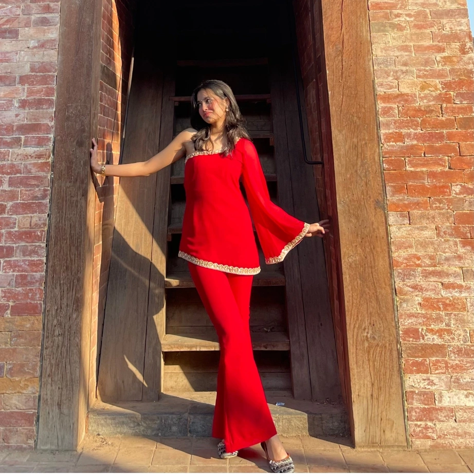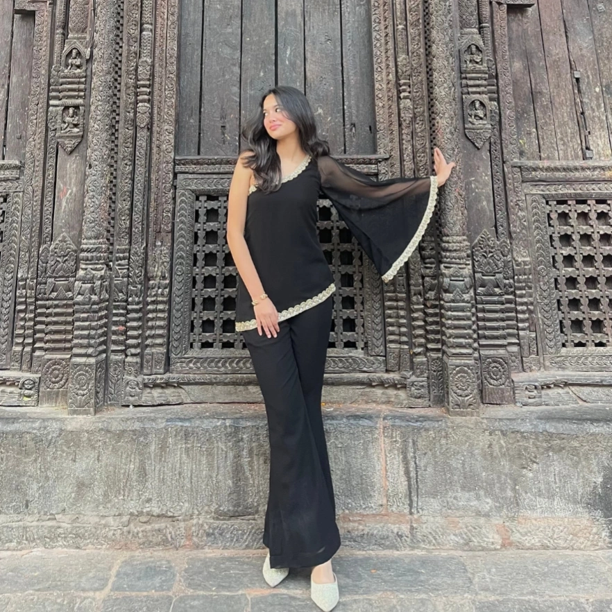 This one-shoulder kurti set is a perfect combination of modern silhouette, rich fabric, and timeless elegance, making it a must-have statement piece in your wardrobe.