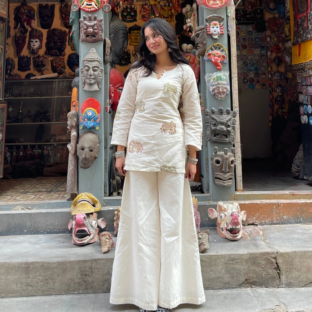 The inner lining is made with premium crepe silk, giving you unmatched comfort along with a rich, graceful drape. What truly makes this kurti special is its stunning hand embroidery, featuring intricate elephant design patterns that symbolize tradition, beauty, and cultural elegance.